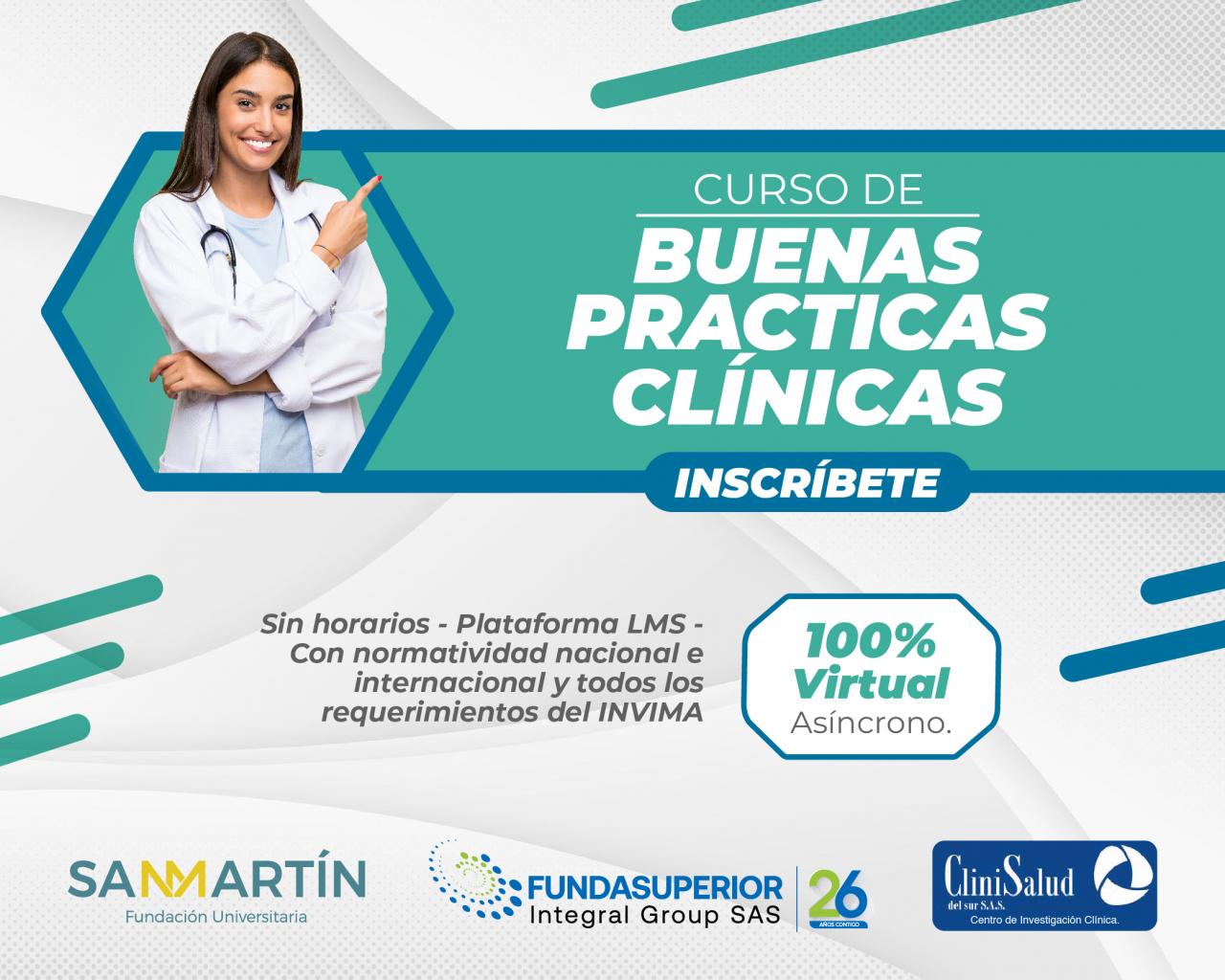 El centro de investigación Clinisalud del Sur, pone a disposición de todos la experiencia de más de 12 años de su personal en ensayos clínicos para el desarrollo de este curso, el cual además de práctico y fácil de realizar, le permitirá cumplir con el requerimiento legal y le aportará herramientas valiosas en el desarrollo de los procesos de investigación y ensayos clínicos. Este curso es posible gracias a la alianza realizada con Fundasuperior Integral Group SAS, institución con más de 20 de experiencia en elaboración de cursos, programas/eventos científicos, académicos, y la Universidad San Martín, Institución de gran prestigio en salud en el país.